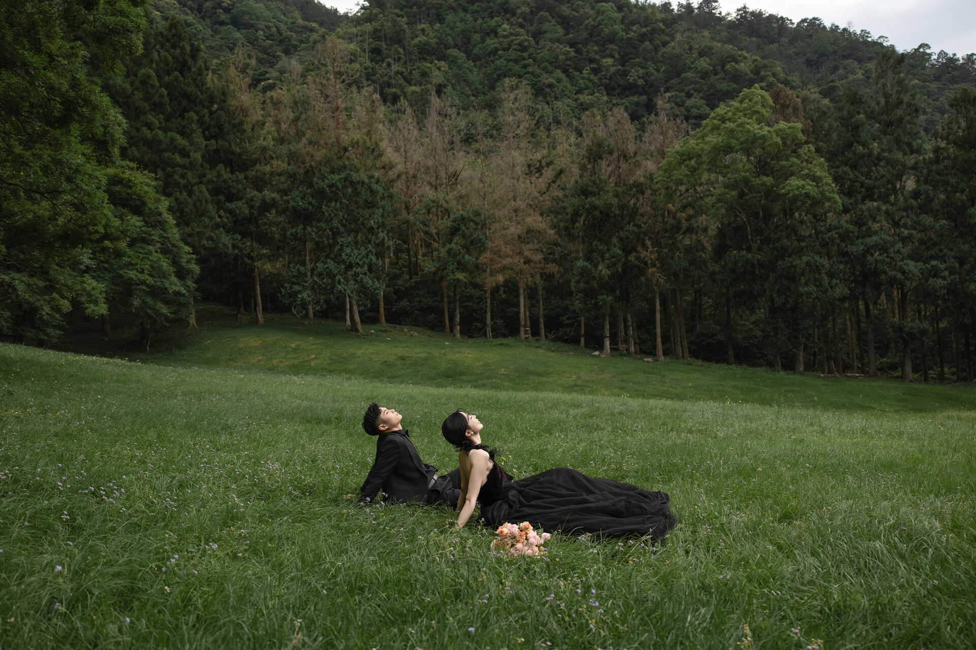 選擇輕盈紗質、柔軟飄逸的禮服最能襯托草地的自由感;蓬裙白紗、黑紗、或是淡藍、淡粉色的禮服,都能與陽光的色溫完美融合,呈現乾淨、空氣感的浪漫。