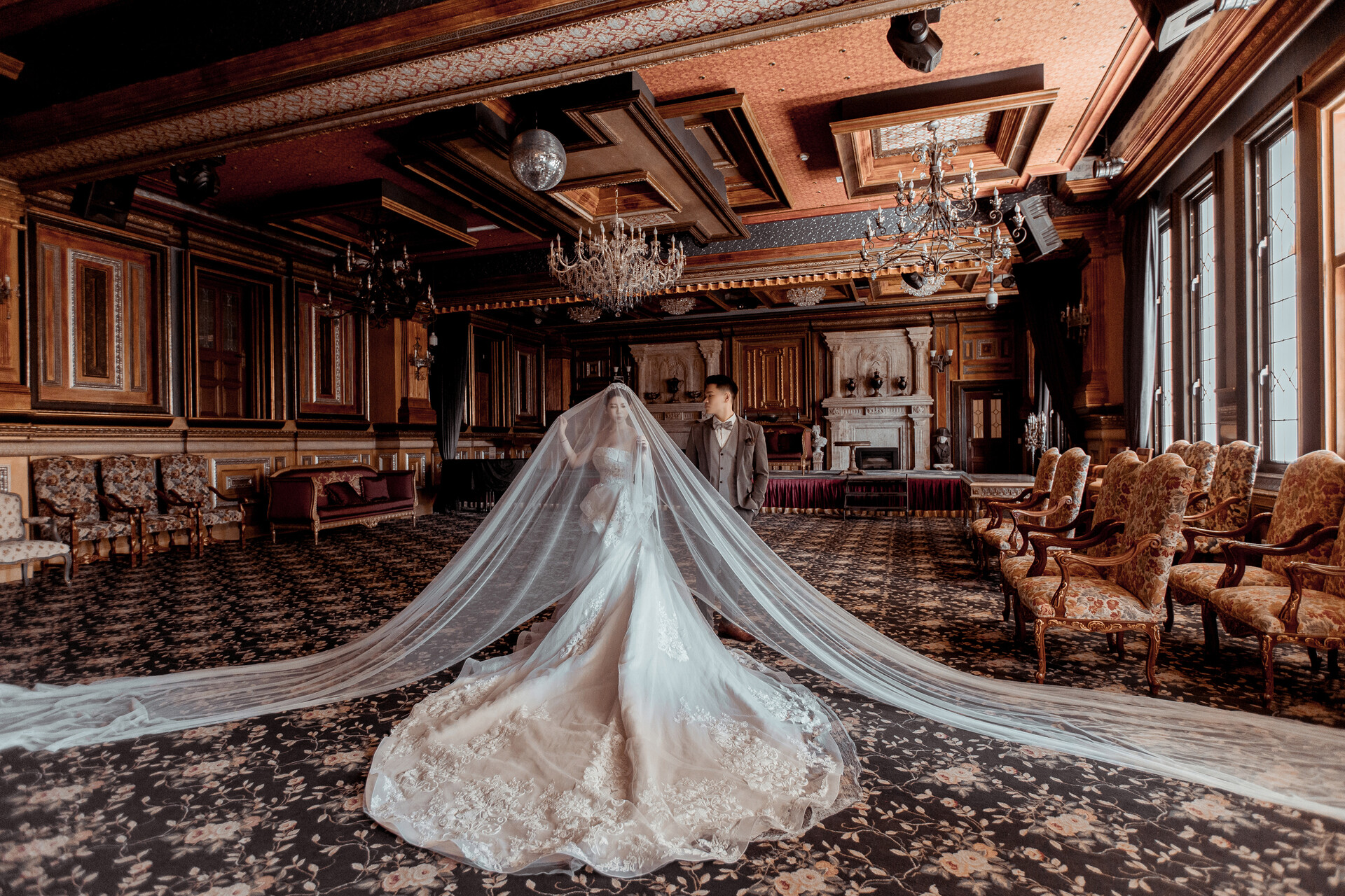 最適合搭配華麗大白紗、拖尾蓬裙、大裙擺、公主袖、法式蕾絲或宮廷感剪裁等禮服,越有氣勢、越有層次的款式,越能把歐式場景襯托得非常到位。