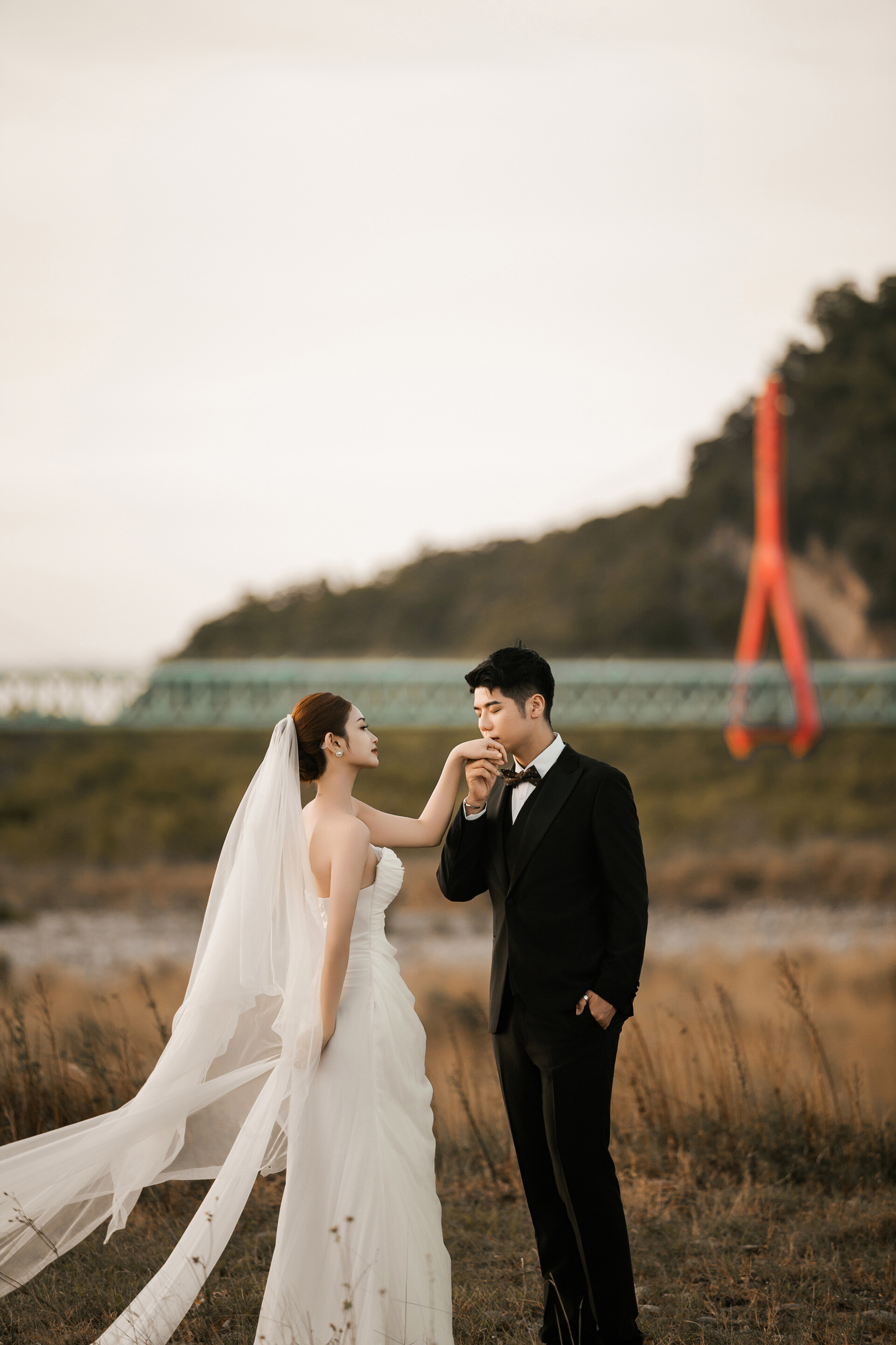 禮服選擇上,輕紗、飄逸裙襬或線條簡單的款式最能融入自然景色,讓人物與風景保持平衡。
