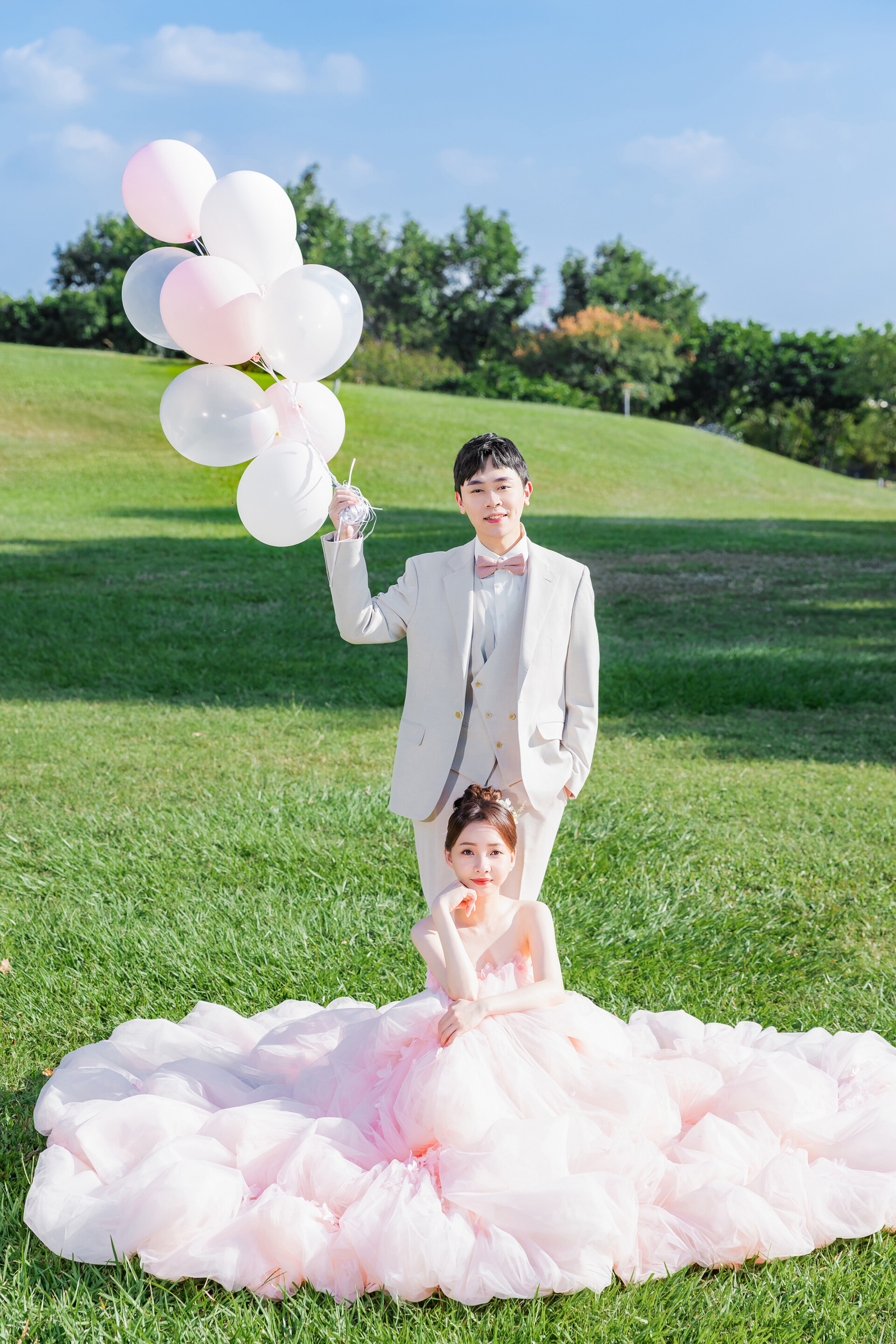 草地婚紗照總帶著一種輕柔的幸福氣息。陽光越過樹影落在肩頭,風把裙襬吹得微微翹起,腳步踩在草地上,彷彿連呼吸都變得明亮起來。自然光影下最真實的笑容,像在大自然懷抱裡的一場溫柔約會。