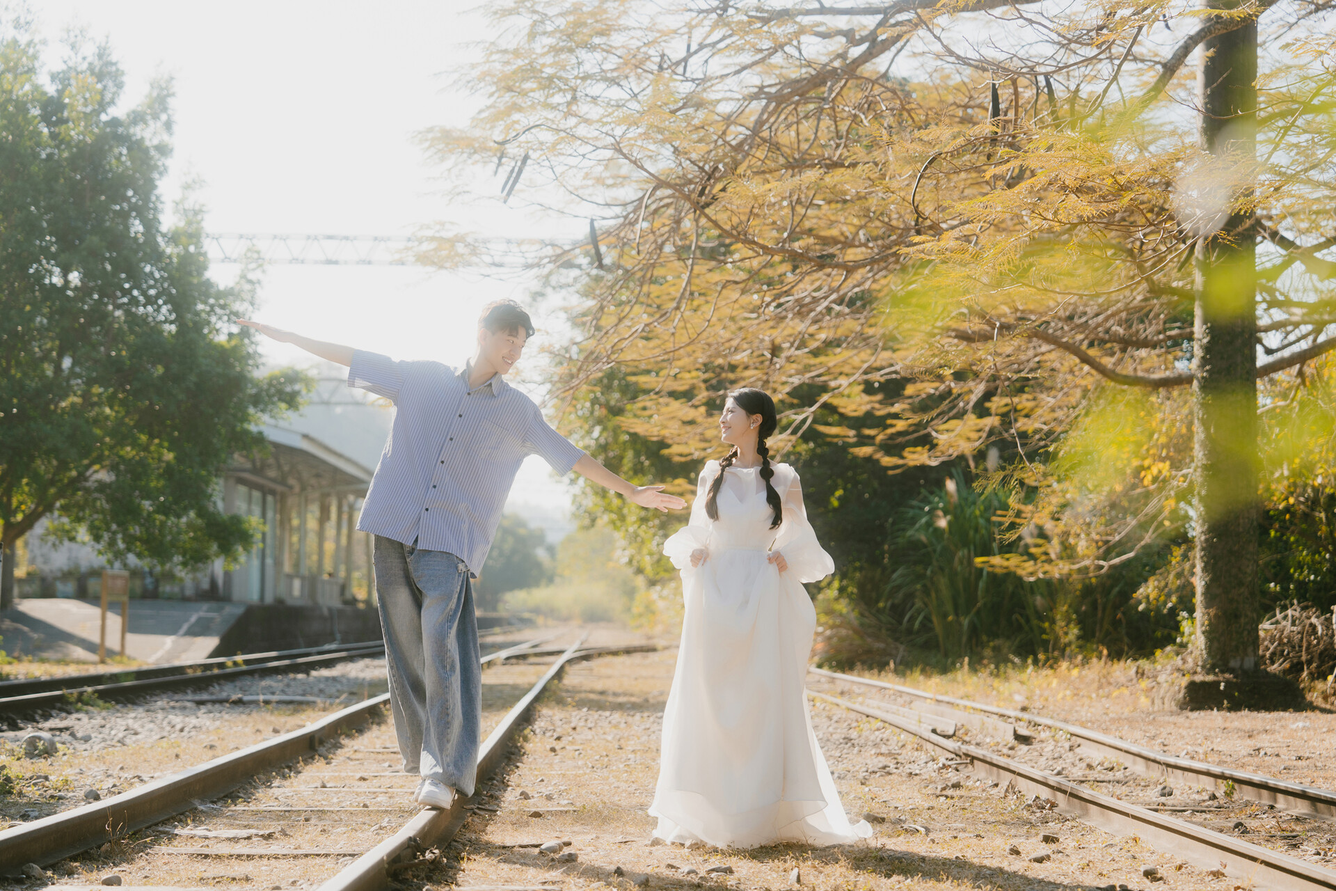 陽光穿過枝葉縫隙落在地面,光影交錯之間,白紗被映襯得更加純淨。當新人漫步於林間小徑,裙襬掃過落葉,紅褐色調與禮服的潔白形成細膩對比,畫面自然流動,情緒在森林的包圍中慢慢展開。